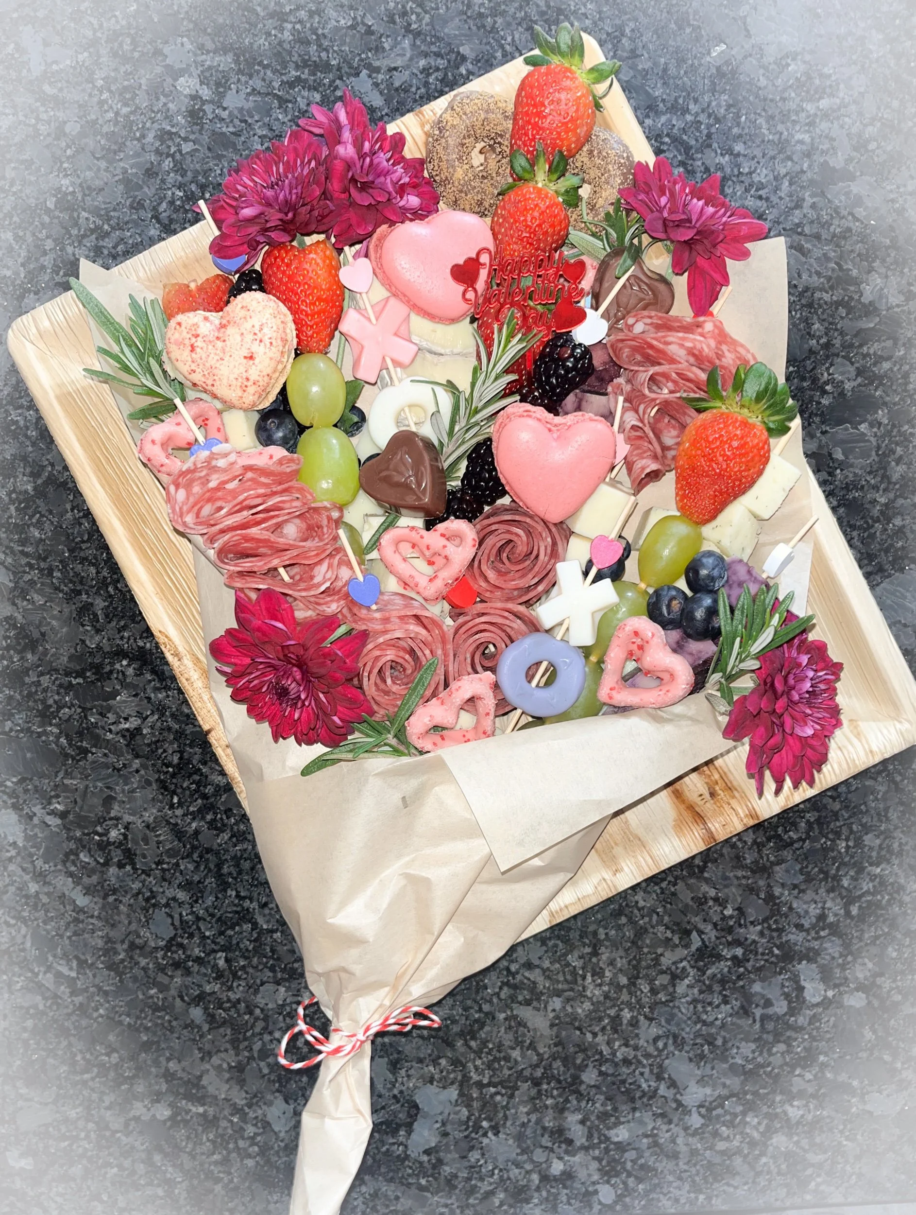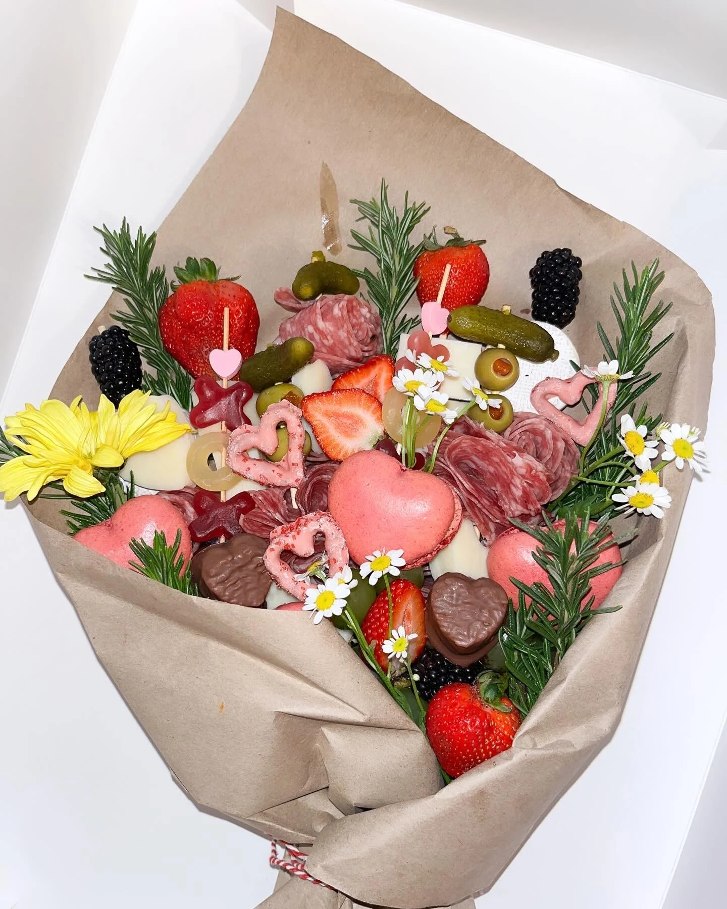 Think floral bouquet but filled with salami roses, cheese kabobs, fresh fruit and sweet treats. Perfect for gifting!